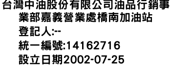 高雄市苓雅區建民路1號15樓之2台灣中油股份有限公司油品行銷事業部嘉義營業處橋南加油站-統編:14162716