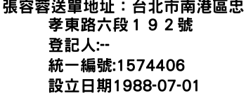張容蓉送單地址:台北市南港區忠孝東路六段192號