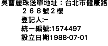 吳曹麗珠送單地址:台北市健康路268號2樓