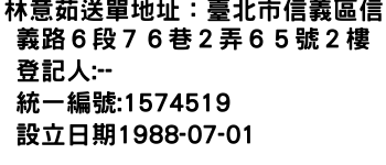 林意茹送單地址:臺北市信義區信義路6段76巷2弄65號2樓