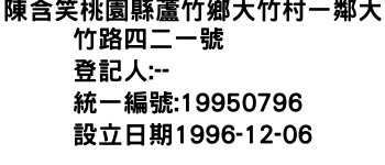 陳含笑桃園縣蘆竹鄉大竹村一鄰大竹路四二一號