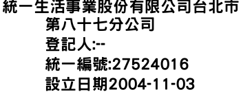 統一生活事業股份有限公司台北市第八十七分公司
