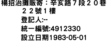 楊招治攤販寄:辛亥路7段20巷22號1樓