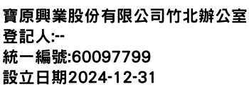 臺北市大同區南京西路57號3樓之11寶原興業股份有限公司竹北辦公室-統編:60097799