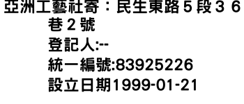 新北市樹林區彭興里國凱街50巷29號5樓亞洲工藝社寄:民生東路5段36巷2號-統編:83925226