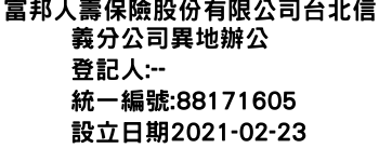 臺北市中山區松江里建國北路2段236、238號富邦人壽保險股份有限公司台北信義分公司異地辦公-統編:88171605